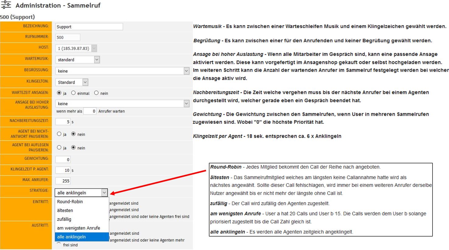Hier können die Benutzer welche dem Sammelruf zugewiesen sind hinterlegt werden. Die Penalty beeinflusst direkt, je nach der eingestellten Strategie, an wen welcher Call zugestellt wird.