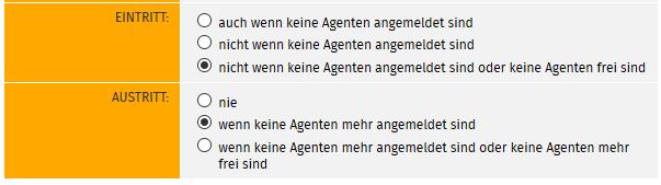Hier kann der Eintritt bzw. der Austritt aus der Warteschleife des Sammelrufs konfiguriert werden. Beispielsweise kann bei keiner aktiven Ansage ausserhalb der Geschäftszeiten der Eintritt in den Sammelruf verhindert oder erlaubt werden.